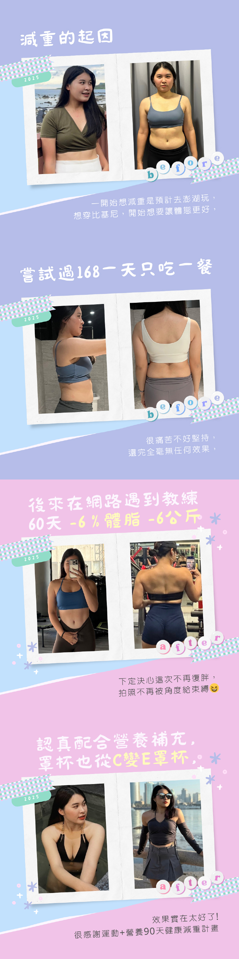 過程中有運動,也有搭配營養補充,整體很有規劃、感覺很踏實。60天下來,體重瘦了6公斤,體脂也降了6%。身體線條變緊實,已經能自在地拍照,不用再想著「這個角度會不會很胖」、「這樣是不是要把肚子藏起來」真的超開心!