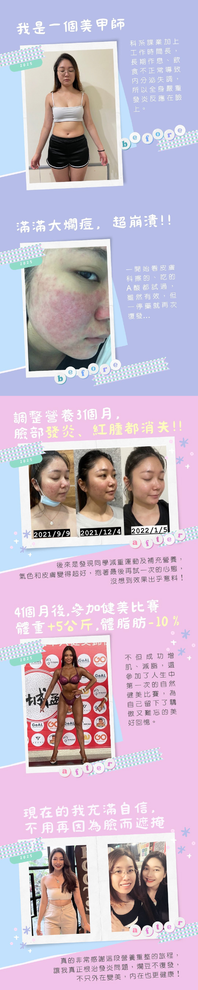 現在的我充滿自信,不用再因為臉而遮遮掩掩了。真的非常感謝這段營養重整的旅程,讓我真正根治發炎問題,爛豆不復發,不只外在變美,內在也更健康!