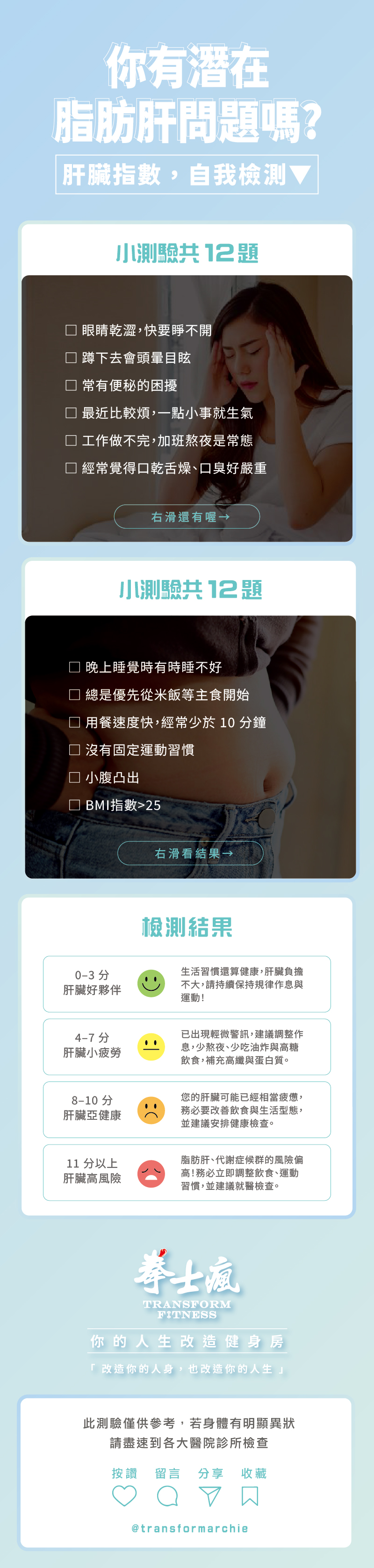 小提醒:此測驗僅供參考,若經常感到疲勞、頭暈、眼睛乾澀或有其他異常症狀,建議及早就醫檢查,給肝臟最好的保護。